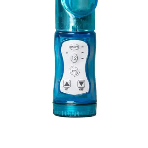 Blauwe rabbit vibrator van EasyToys. Deze rabbit vibrator zal jou intens verwennen! Met 12 vibratiestanden en 3 rotatie standen zal het genot wat deze vibrator je geeft van ongekende hoogten zijn. Het konijntje kietelt met zijn oortjes de clitoris terwijl de kralen je van binnen stimuleren. Alle standen zijn gemakkelijk te bedienen op het bedieningspaneel aan de onderzijde.